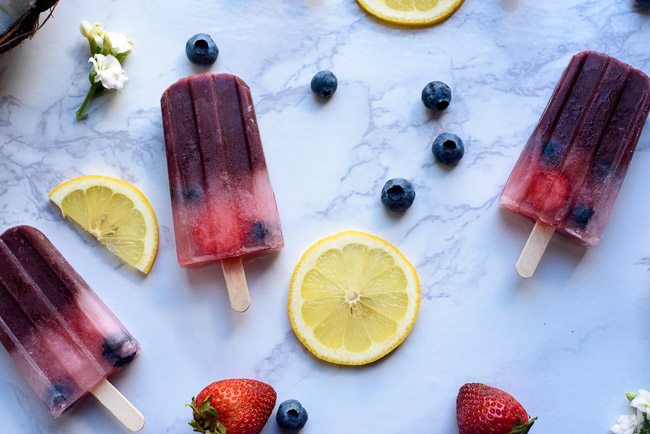Combine coconut water and lemon juice. Add berries and fill popsicles ¾ of the way with the coconut lemon mixture. Freeze until solid, at least 4 hours preferably overnight.