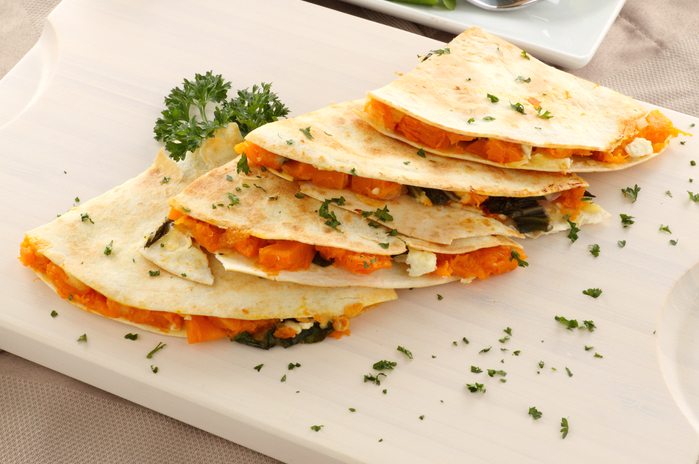 Spread pumpkin mixture, onions and peppers over 1 tortilla. Then sprinkle with cheese. Top with remaining tortilla.