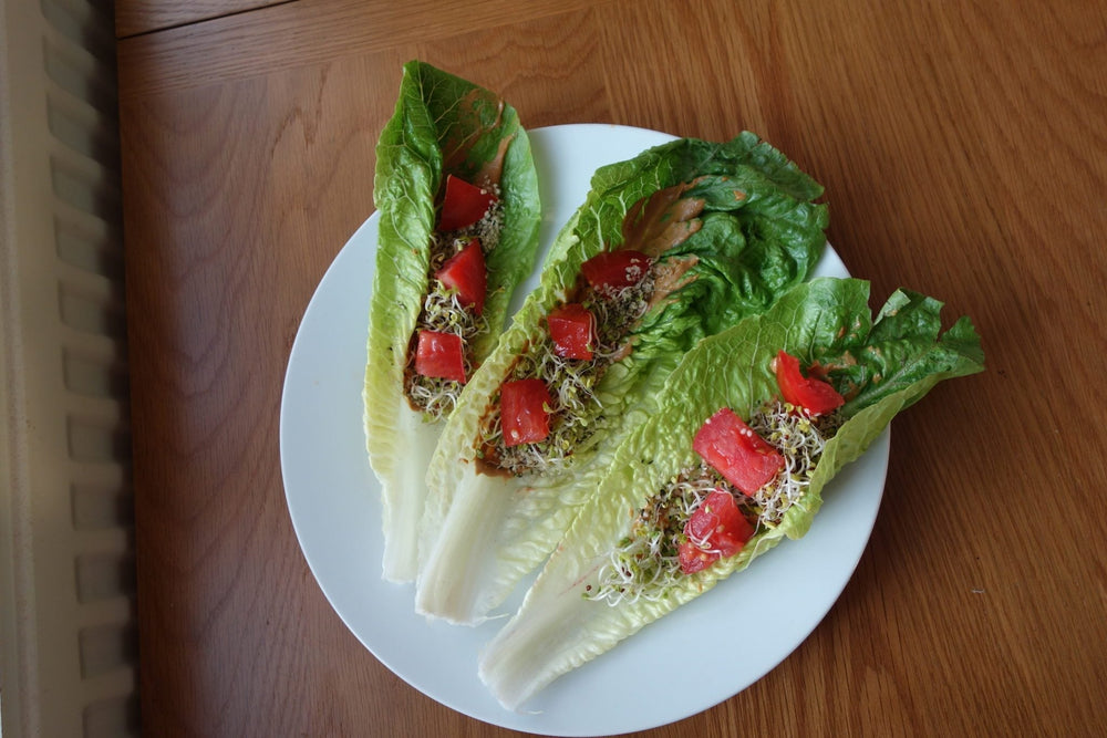 In a small bowl or container mix together the Dijon mustard, tahini and tamari. Spread onto the 3 lettuce leaves evenly. Top 1/2 Tbs. of hemp seeds onto each lettuce leaf, and then top with some sprouts and tomato slices.